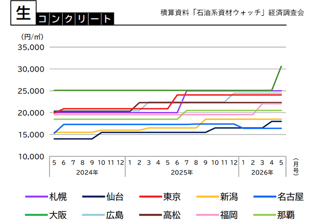 主要10都市の生コンクリート市況は、「大阪」で3万600円/㎥となり前月の2万5100円/㎥から大きく上昇。先行きでは「高松」で強含みとなる見通しだ。