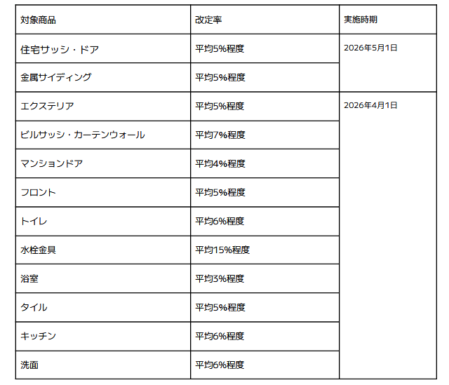 4月1日実施は、エクステリア(平均5%程度)、ビルサッシ・カーテンウォール(平均7%程度)、マンションドア(平均4%程度)、フロント(平均5%程度)、トイレ(平均6%程度)、水栓金具(平均15%程度)、浴室(平均3%程度)、タイル(平均5%程度)、キッチン(平均6%程度)、洗面(平均6%程度)。